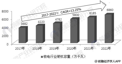 根據(jù)《核電中長(zhǎng)期發(fā)展規(guī)劃(2011-2020年)》以及核電十三五規(guī)劃,前瞻產(chǎn)業(yè)研究院預(yù)判到2022年我國(guó)核電總體裝機(jī)容量將超過(guò)6800萬(wàn)千瓦,在建裝機(jī)容量超過(guò)3000萬(wàn)千瓦,2017-2022年均復(fù)合增長(zhǎng)率在為13.25%,核電產(chǎn)業(yè)發(fā)展空間巨大。