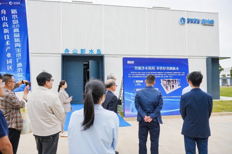 通水儀式結(jié)束后,與會人員共同實(shí)地考察了新水島 2.0 水廠。該項目占地面積僅 300 平方米,采用金科環(huán)境自主研發(fā)的 “新水島 2.0” 工程模塊化產(chǎn)品與 “水蘿卜 AI 智能體” 運(yùn)營管理平臺,以污水處理廠出水為水源,通過 “超濾 + 反滲透” 先進(jìn)處理工藝,使供水水質(zhì)遠(yuǎn)超《城市污水再生利用 — 工業(yè)用水水質(zhì)》標(biāo)準(zhǔn),完全滿足國內(nèi)外光伏企業(yè)高標(biāo)準(zhǔn)生產(chǎn)用水需求。項目總設(shè)計產(chǎn)水規(guī)模達(dá) 2 萬噸 / 天,其中一期產(chǎn)水規(guī)模 5000 噸 / 天,服務(wù)范圍覆蓋舟山高新區(qū)內(nèi)新能源、化工等重點(diǎn)工業(yè)企業(yè),目前一期產(chǎn)出的再生水已主要供應(yīng)園區(qū)內(nèi)光伏企業(yè),為當(dāng)?shù)匦履茉串a(chǎn)業(yè)發(fā)展注入了綠色動力。