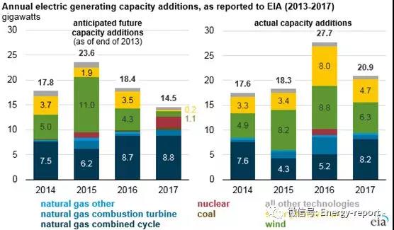核電裝機增量也面臨推遲并網:在2013年年末,田納西州的沃茨巴(WattsBar)核電站2號機組預計在2015年并網,而另外兩個核電站預計在2017年并網。但實際上,沃茨巴(WattsBar)核電站2號機組2016年6月才完成并網,其他的兩個項目(佐治亞州的沃格特勒