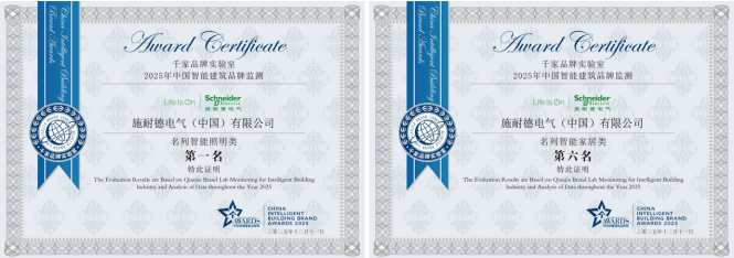 憑借在建筑領(lǐng)域的領(lǐng)先技術(shù)和綜合成果,施耐德電氣獲得了廣泛市場(chǎng)認(rèn)可,在千家品牌實(shí)驗(yàn)室主辦的年度評(píng)選中,連續(xù)第六年榮獲“2025年十大智能照明品牌第一名”,并且還斬獲“2025年度十大建筑能源管理第三名”及“2025年樓宇自控領(lǐng)先品牌獎(jiǎng)”等多項(xiàng)榮譽(yù)。值得一提的是,施耐德電氣還在今年首次入選了“智能家居品牌第六名”,實(shí)現(xiàn)了全新突破。