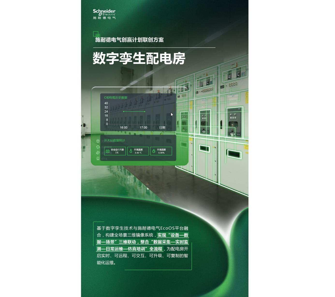“數字孿生配電房”來自2021年創贏計劃,它為電力系統引入了可視化決策能力。該系統基于EcoOS生態平臺構建三維映射,將設備狀態、運行數據與運維流程匯聚于統一界面之中,使配電系統首次從不可見轉為可感知。