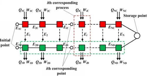如圖1所示,壓縮空氣儲能系統(tǒng)流程存在對應(yīng)性,將流程對稱的過程稱為對應(yīng)過程,將流程上對稱的點(diǎn)稱為對應(yīng)點(diǎn),模型將儲能過程和釋能過程各分為N個過程,一一對應(yīng),從而形成N個對應(yīng)過程(如圖中虛線框所示為第i個對應(yīng)過程)和N+1個對應(yīng)點(diǎn)。為了清晰表達(dá)系統(tǒng)中?轉(zhuǎn)換和傳遞特性,提出了熱-機(jī)械?(Eth-Emech圖)圖像?方法。相對于傳統(tǒng)的優(yōu)化分析方法,對應(yīng)點(diǎn)分析優(yōu)化算法具有以下優(yōu)點(diǎn):能夠清晰揭示儲能和釋能過程之間的能量傳遞機(jī)理;有利于探索不同熱力過程的耦合關(guān)系;有利于獲得系統(tǒng)性能改進(jìn)和優(yōu)化的方向。