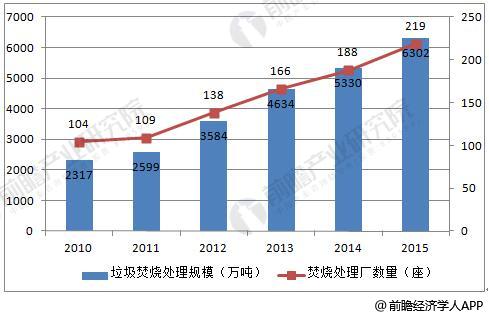 2010-2015年中國城市生活垃圾焚燒處理統(tǒng)計(jì)情況