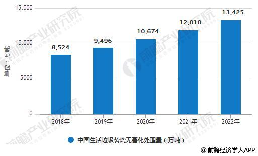 據(jù)前瞻產(chǎn)業(yè)研究院發(fā)布的《垃圾發(fā)電行業(yè)市場前瞻與投資戰(zhàn)略規(guī)劃分析報(bào)告》統(tǒng)計(jì)數(shù)據(jù)顯示,預(yù)計(jì)2018年中國城市生活垃圾焚燒無害化處理量將達(dá)到8524萬噸,未來五年(2018-2022)年均復(fù)合增長率約為12.03%,預(yù)計(jì)到2022年中國城市生活垃圾焚燒無害化處理量將達(dá)到13425萬噸。