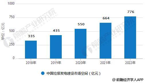 預(yù)計(jì)2018年中國垃圾發(fā)電建設(shè)市場空間將達(dá)到335億元,未來五年(2018-2022)年均復(fù)合增長率約為23.37%,預(yù)測到了2022年中國垃圾發(fā)電建設(shè)市場空間將達(dá)到776億元。