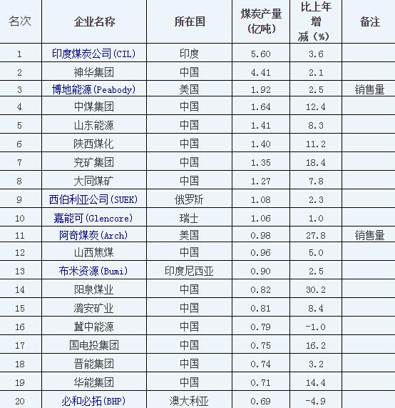 2017年全球前20家煤企產(chǎn)量排名