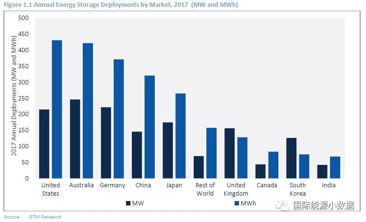 根據(jù)GTMResearch日前發(fā)布全球儲能報告,2017年全球新增儲能容量1.4吉瓦、電量230萬千瓦時。從容量的角度來看,澳大利亞新增246兆瓦,居全球首位;從電量的角度看,美國新增43.1萬千瓦時,居全球首位。2017年中國的新增儲能容量約為150吉瓦/32萬千瓦時。