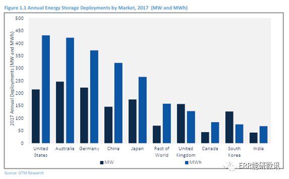 2017年是儲能領域最激動人心的年份之一,多個市場出現了形成性的政策發展、有趣的商業模式以及一股企業的兼并和收購活動。2017年,全球共部署了1.4吉瓦和2.3吉瓦小時的儲能,其中澳大利亞在電力容量方面處于領先位置,達到246兆瓦,而美國市場在能源容量方面領先全球,達到431兆瓦時。